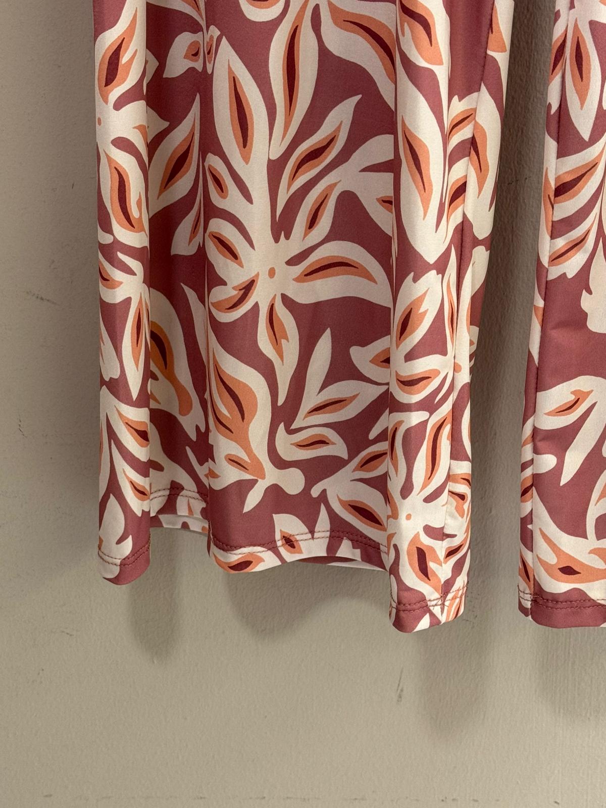 Pantalón palazzo de corte amplio y fluido con estampado floral tropical en tonos rosa palo, crudo y terracota. Su diseño de flores y hojas de gran formato le aporta un carácter veraniego y desenfadado, perfecto para looks de playa, ciudad o noche. La cinturilla elástica garantiza un ajuste cómodo y adaptable.